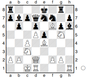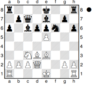 Hier spielte Tim den sehr mysteriösen Zug 14…0-0-0??, wonach er kompensationslos den Springer auf f6 verliert. Nach 14…dxe5 15.Lg6+ Kf8 16.0-0 Le8 ist die Stellung ausgeglichen. Was vielleicht umso überraschender ist, ist, dass Tim die Partie noch Remis hielt.
