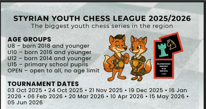 Auch in Slowenien gibt es eine attraktive Jugendschachserie: Die Styrian Youth Chess League in Maribor umfasst zehn Turniere von Oktober 2025 bis Juni 2026 und richtet sich an mehrere Altersklassen von U8 bis zur offenen Gruppe. Gespielt werden jeweils 7 Runden im Schweizer System mit 7 Minuten plus 3 Sekunden pro Zug. Neben Medaillen und Sonderpreisen sorgt auch die kompakte Nachmittagsform für ein interessantes Angebot für junge Schachspieler.