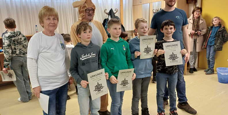 Für die jungen Kindberger U08-Spieler Philine Aldrian, Emil Brickmann und Erik Müllner war es die erste Turniererfahrung, und sie meisterten diese Herausforderung mit großem Einsatz und sichtlicher Begeisterung. Noel Eisner, der erst Mitte April sechs Jahre alt wird und in Mondsee dabei sein wird, zeigte eine bemerkenswerte Leistung: Er erreichte den hervorragenden 8. Gesamtplatz und gewann mit 4 Punkten auch die U08-Wertung. Nach dem Turnier wartete noch eine Überraschung auf die Kinder: Der Osterhase hatte sich angekündigt und brachte für jeden Teilnehmer ein gefülltes Osternest mit.